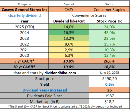 Casey's is a Dividend Hero but the company is not a top-25 stock: last year the dividend was hiked by 16.3% following a 13.2% hike in 2023. The dividend yield for CASY is 0.5% at a stock price of $490.
