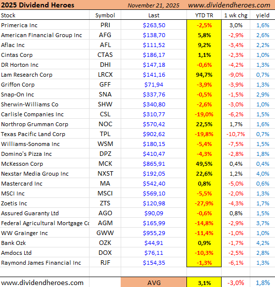 In this article we look at the top and bottom 5 Dividend Heroes in 2025 + we will look at the Dividend Heroes Portfolio (the top-25 ranked Heroes based on stats). Please note that our top-5 gainers and losers in this article includes many stocks that didn’t make it to the top-25 for 2025 (and for that reason are not in the Dividend Heroes Portfolio).