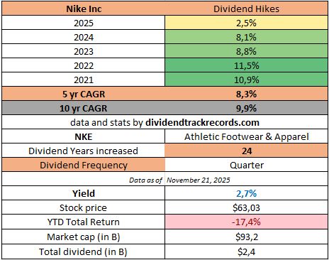 A notable number of Heroes will leave the list in 2026 due to insufficient dividend growth. Nike NKE 0.00%↑ stands out — its 2.5% dividend increase in 2025 is the smallest in its history, placing it below the minimum threshold for multi-year dividend growth criteria.