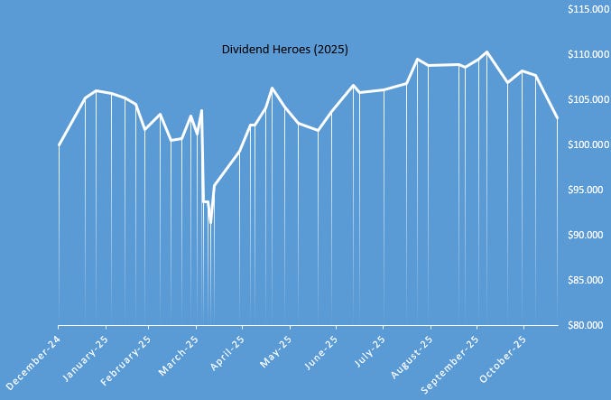 The Dividend Heroes portfolio has delivered just 3.1% YTD in 2025, a very weak outcome when compared to the DividendHike Portfolio, which is up 13.3% YTD. The structural reason is clear: the Heroes list is strictly statistical and always equal-weighted, meaning every stock — winner or loser — has a fixed 4% portfolio weight.