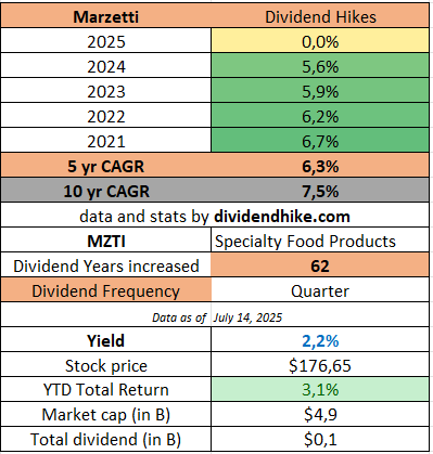 Currently Marzetti pays a $0.95 per share quarterly dividend with a yield of 2.15% at a stock price of $176.65. Marzetti is a Dividend Hero with now 62 consecutive years of increased dividends.
