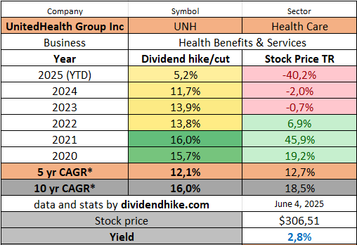 UnitedHealth Group UNH 0.00%β , a long-time Dividend Hero and dominant player in U.S. healthcare, has raised its dividend by only 5.3% this year β a dramatic slowdown for a company that spent over a decade delivering double-digit hikes year after year.